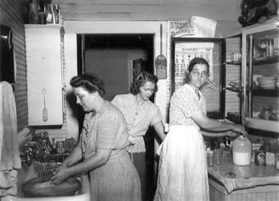 Florence Conner Hearn and Mildred Hearn Walker, helping "Mama" Della Hubbard with a meal in Albertville, AL (August 1946)