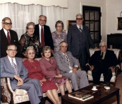 Reunion of Florence Hearn and her brothers, in living room of Florence's Nashville home. Standing from left: Lewis Conner, Florence and Aubrey Hearn, Amy and Eady Conner. Seated from left: Allen and Louise Conner, Louise and Walter Conner, Thomas Conner.