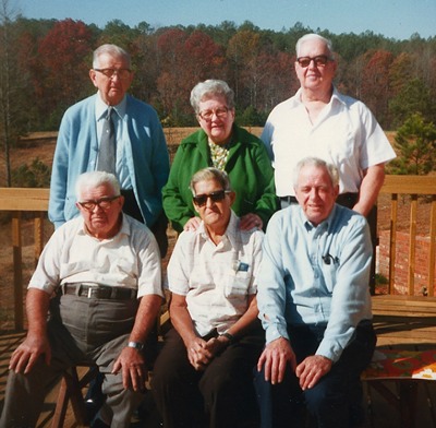 Reunion of T.G. Conner's children. Back row: Allen Conner, Florence (Conner) Hearn, Eady Conner. Front row: Thomas Conner Jr., Lewis Conner, Walter Conner
