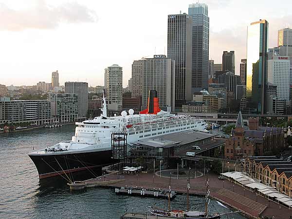 Queen Elizabeth II docked at Sydney harbor, from the Harbour Bridge