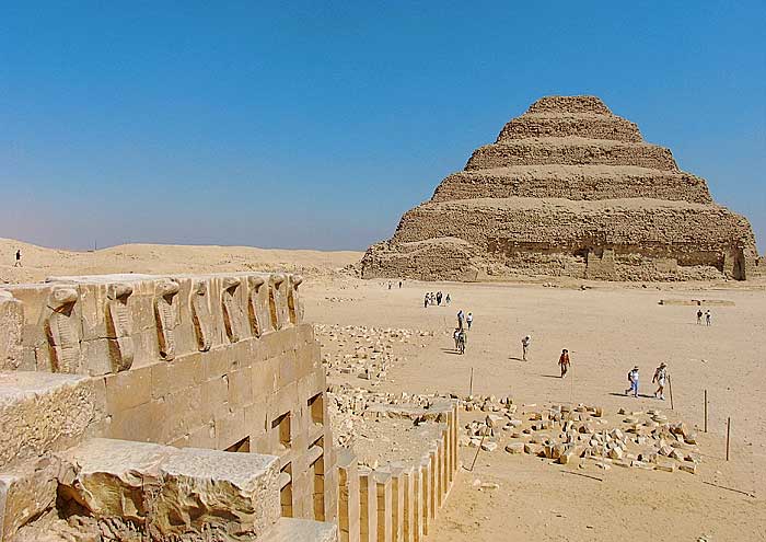 The oldest pyramid, built by Imhotep for King Zoser about 2600 BC. Also shown are cobra sculptures on the associated temple.