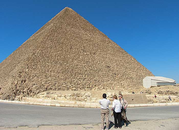 The great Pyramid of Giza, built by pharaoh Cheops around 2560 BC. Also shown is the adjacant museum housing the Solar Boat, discovered in 1954 next to the pyramid.