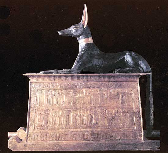 In the Egyptian Museum, the Anubis Shrine found in King Tutankhamun's tomb in 1922, the only intact tomb found so far (from a postcard).