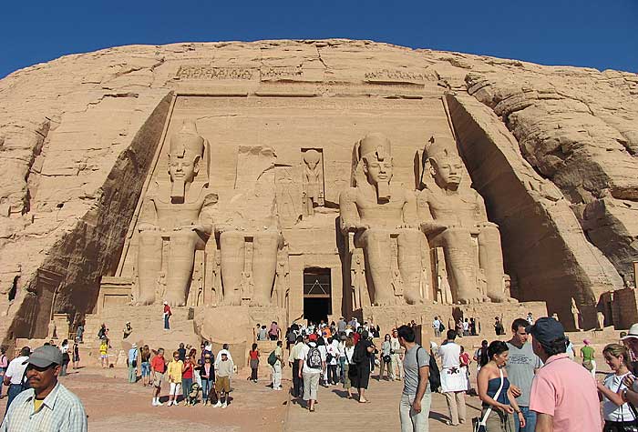 The Great Temple, dedicated to Rameses II. The facade is dominated by four enormous seated statues of the Pharaoh, each almost 70 feet high.