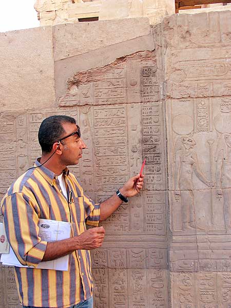 Trip leader Hossam pointing out a hieroglyphic calendar at Kom Ombo Temple.