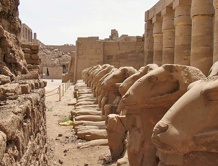 A portion of Karnak Temple with a row of ram-headed sphinxes.