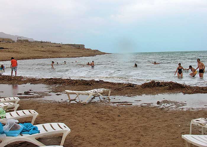 Swimming in the Dead Sea. The weather was cold and windy that day.