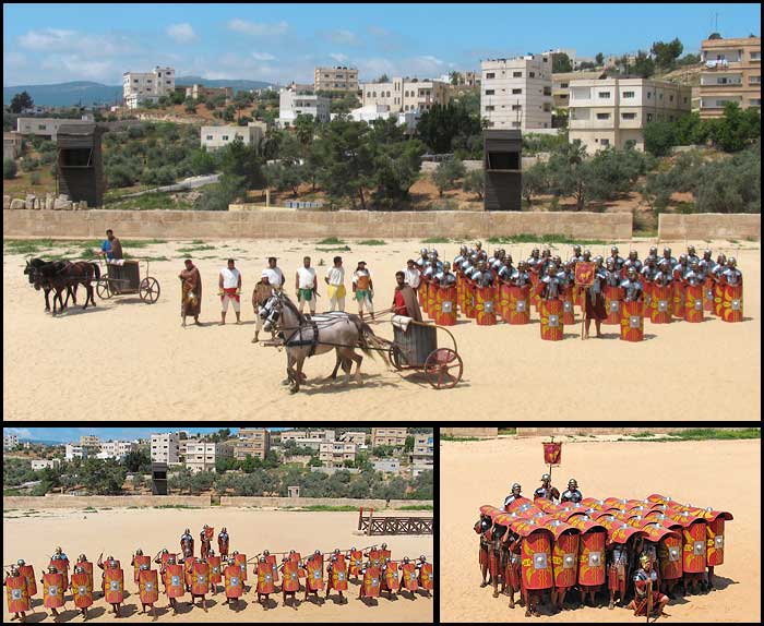 A presentation of Roman battle tactics at the Jerash Hippodrome. Chariots and typical Roman battle formations are shown.