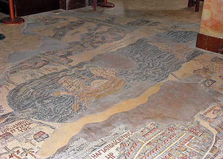 Portion of a mosaic map of the Holy Land, part of the floor of a 6th-century Byzantine church in Madaba.