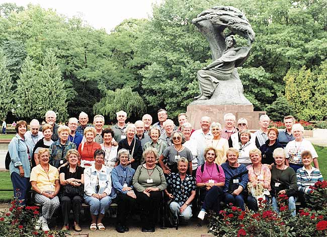 Our tour group, in front of a statue of Frederic Chopin in a Warsaw park.