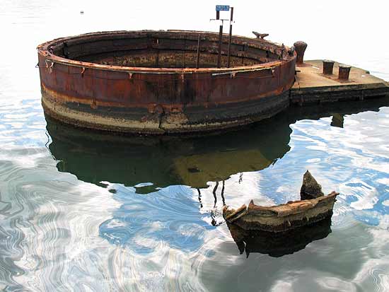 Gun turret of U.S.S. Arizona at Arizona Memorial. Note oil sheen on water.