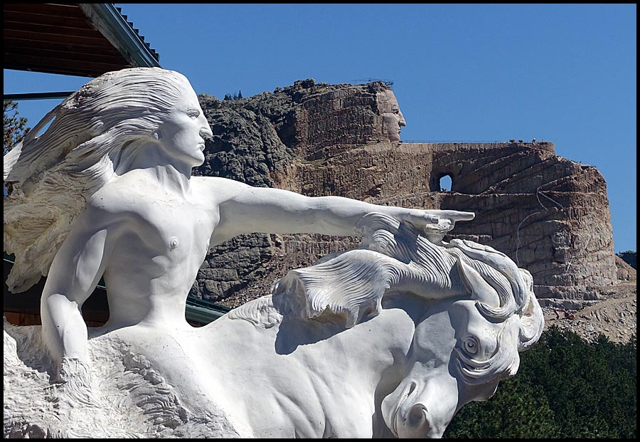 Crazy Horse monument, with model showing expected appearance after final completion.