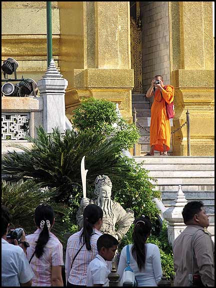 Monk taking pictures of tourists, inside the Grand Palace complex.