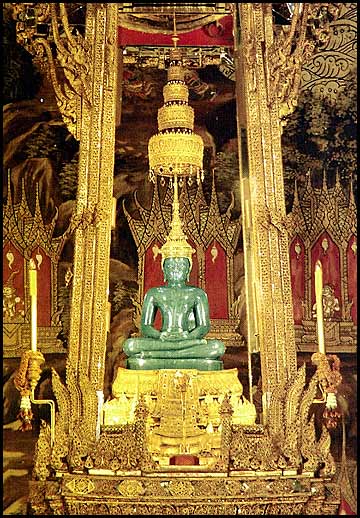 Emerald Buddha, carved from a single piece of jade, inside the Grand Palace complex. (From a postcard.)