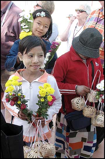 Girls selling flowers at a temple, with sunscreen on their faces.