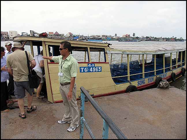 Beginning of tour of the Mekong River delta, with Vietnam tour leader Sinh directing boat loading.