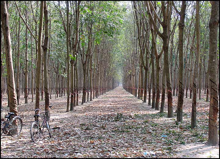 Trees in rubber plantation. Sap is collected from the diagonal cuts in trees.